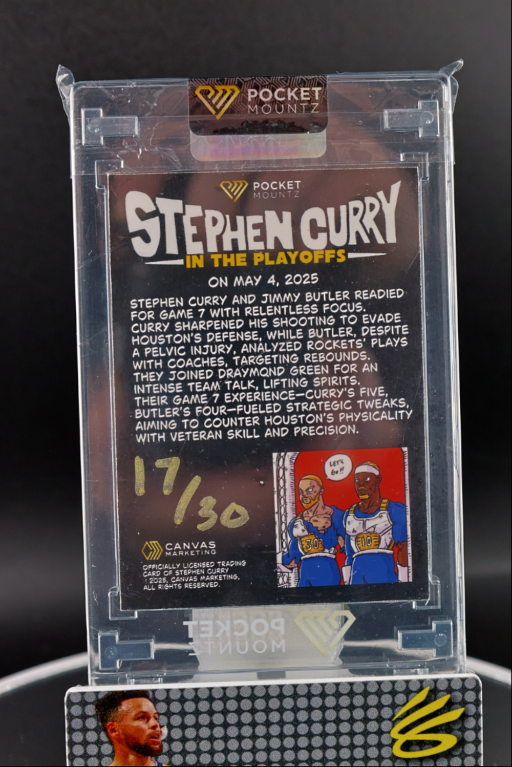 Elevate your collection with this rare Steph Curry "Ready For Game 7" Pocket Mountz trading card, crafted for true fans and serious collectors. Each card is mounted on premium museum glass, offering crystal-clear display quality while preserving the artistry and detail of the design. With only 30 copies short printed worldwide, this exclusive piece is a standout in any collection.