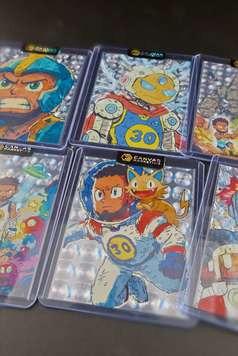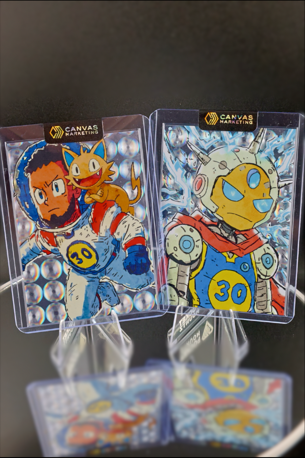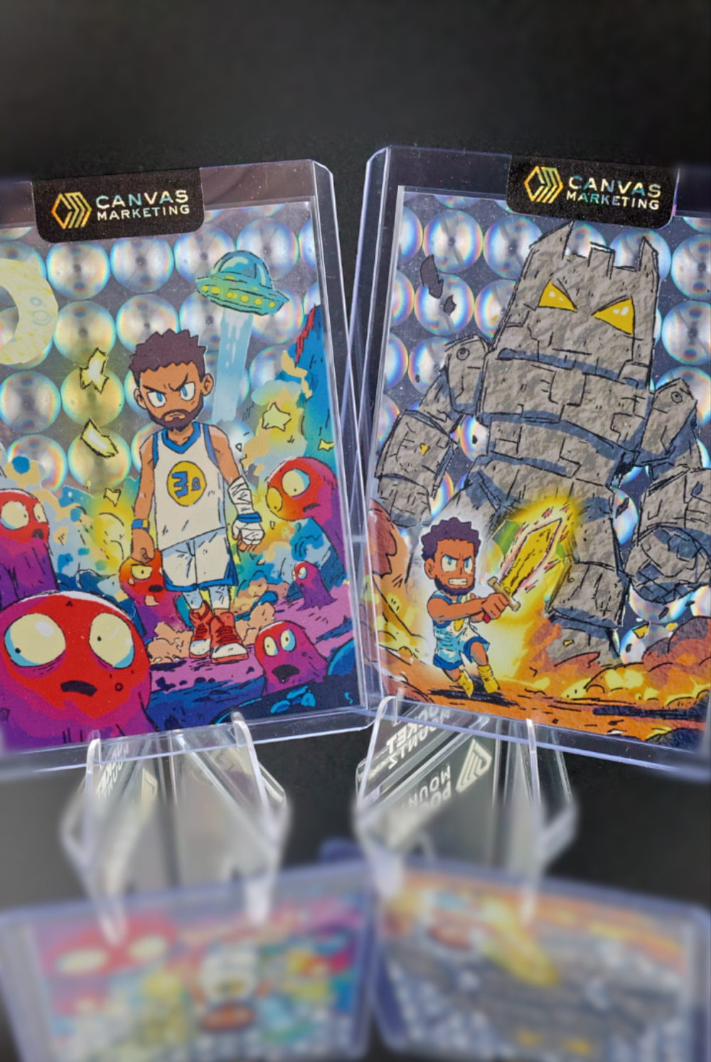 Celebrate greatness with the Steph Curry “Scribes of Destiny” trading card collection — a stunning fusion of art, storytelling, and basketball legacy. Designed and produced by Canvas Marketing, each holographic card captures Steph Curry’s journey through vibrant, comic-inspired illustrations that channel the energy of a futuristic hero and the heart of a champion. Printed on prismatic foil for a radiant, multidimensional shine.