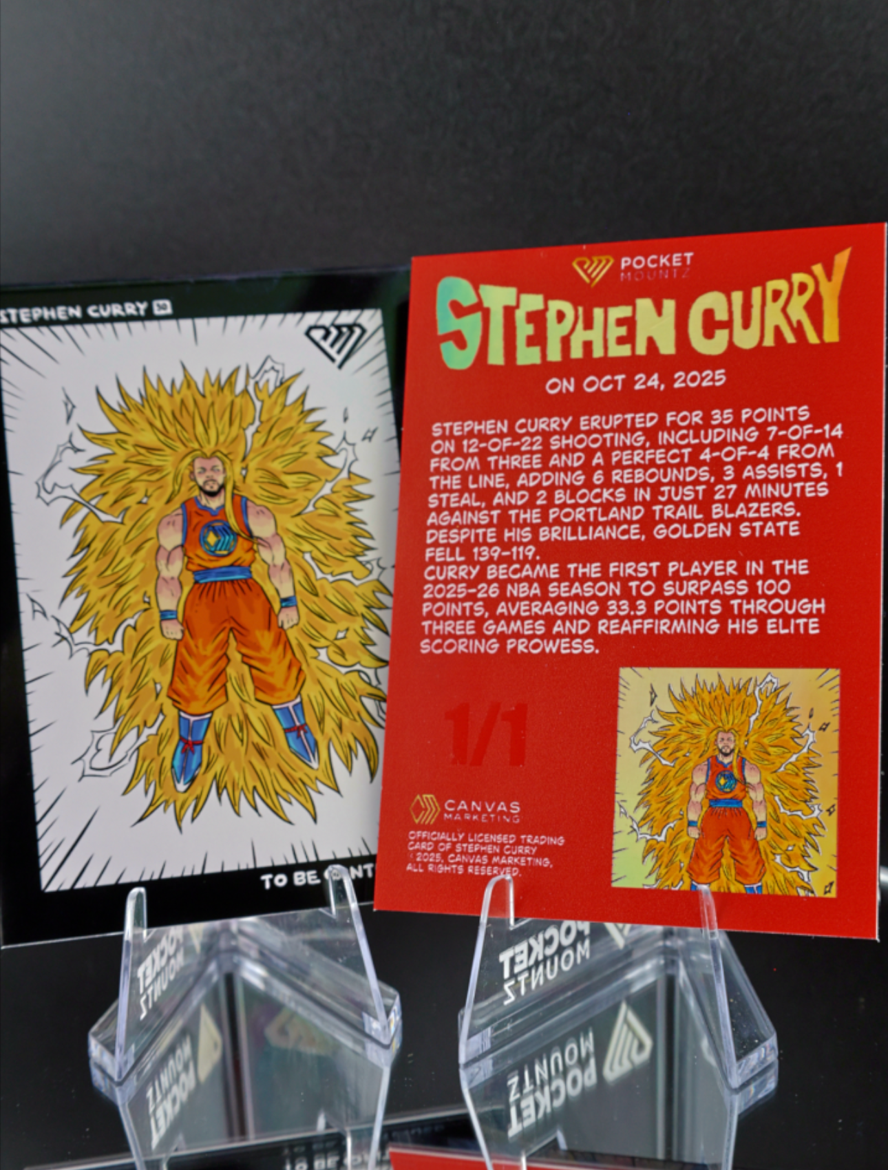 “Super Steph 3x10” channels pure energy into an explosive visual tribute — a transformation born from greatness, precision, and limitless confidence. This Pocket Mountz trading card reimagines the game’s most electrifying shooter as a super-powered force, glowing with unmatched aura and championship energy.