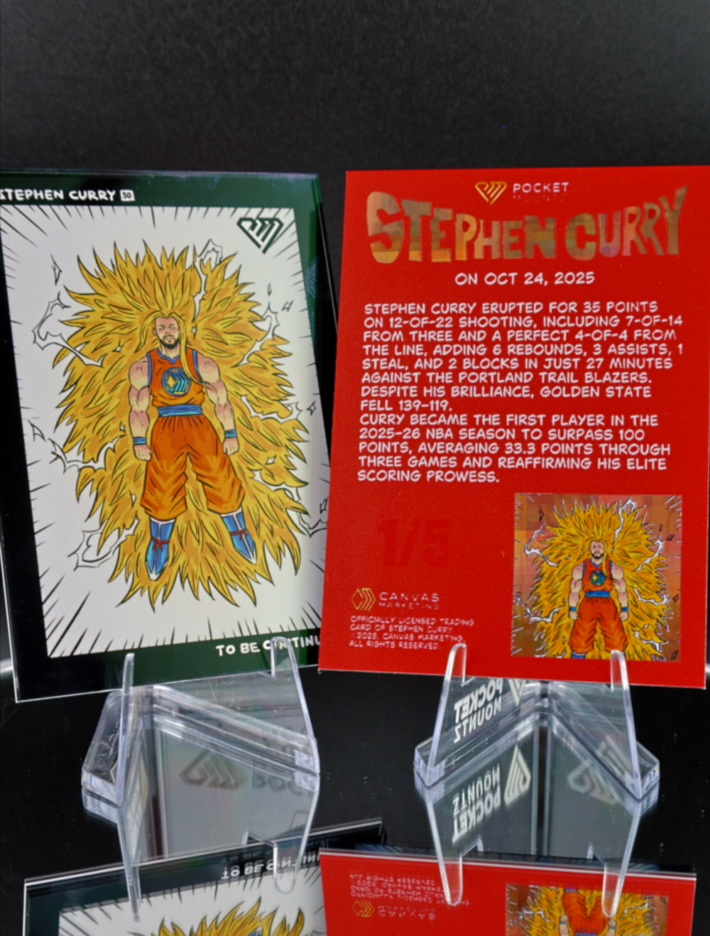 “Super Steph 3x10” channels pure energy into an explosive visual tribute — a transformation born from greatness, precision, and limitless confidence. This Pocket Mountz trading card reimagines the game’s most electrifying shooter as a super-powered force, glowing with unmatched aura and championship energy.
