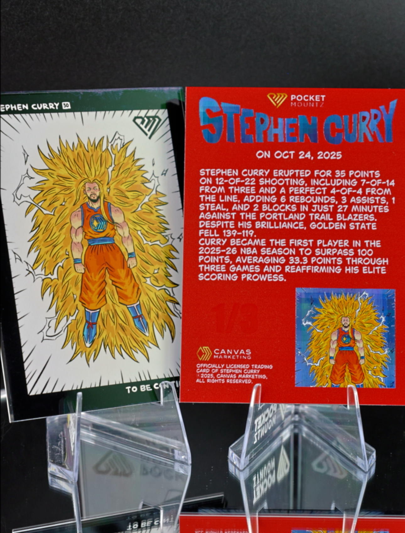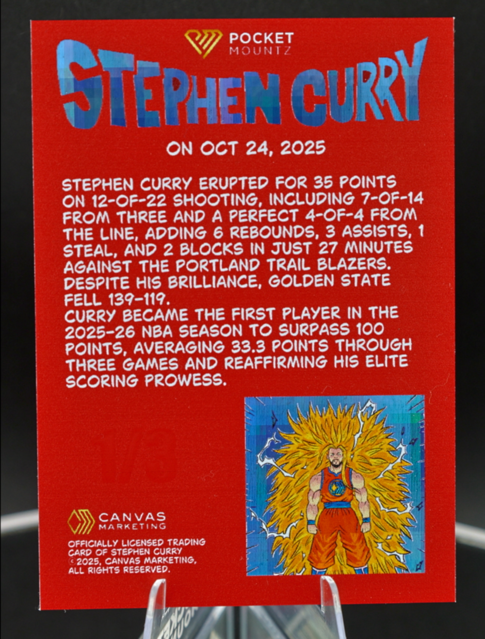 “Super Steph 3x10” channels pure energy into an explosive visual tribute — a transformation born from greatness, precision, and limitless confidence. This Pocket Mountz trading card reimagines the game’s most electrifying shooter as a super-powered force, glowing with unmatched aura and championship energy.
