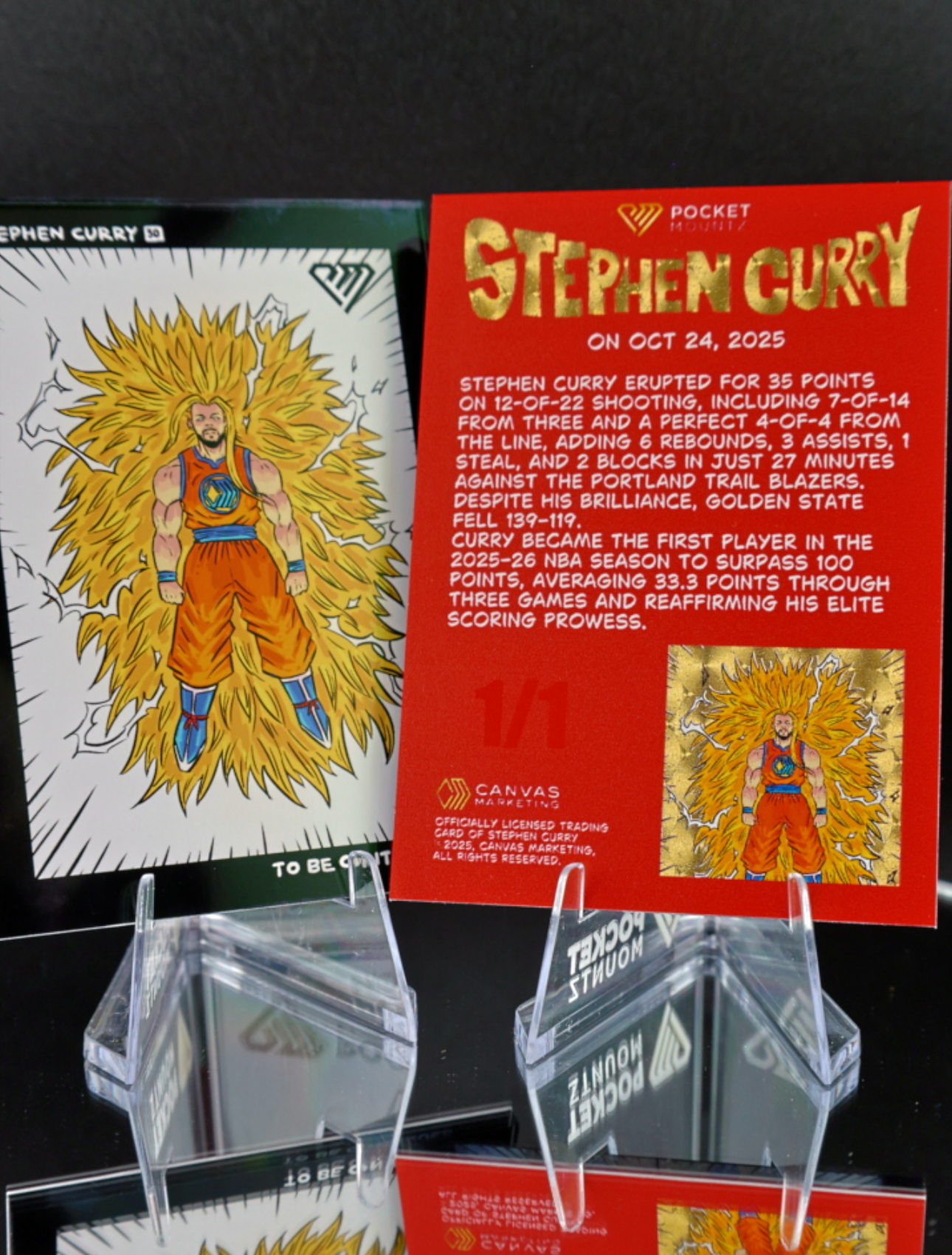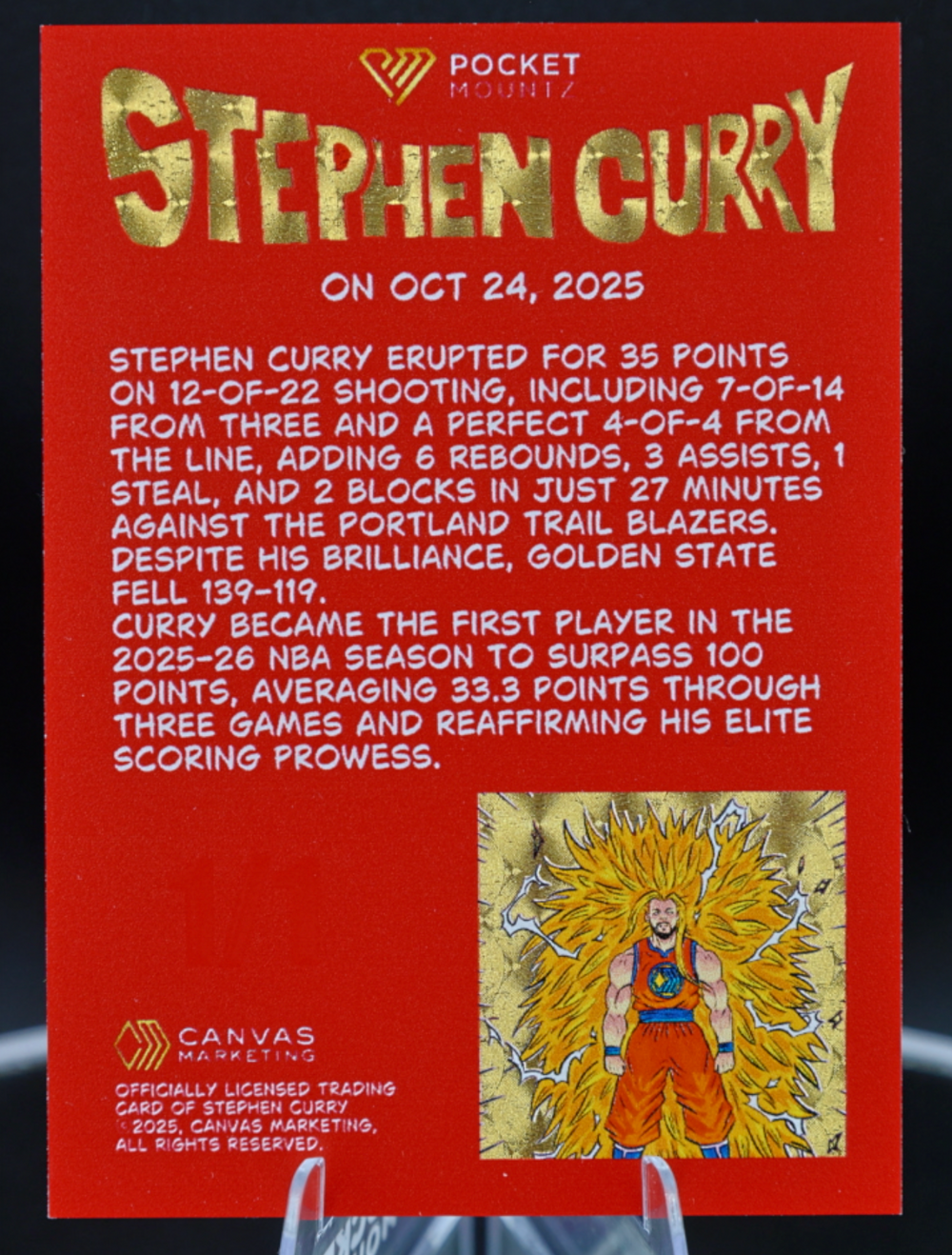 “Super Steph 3x10” channels pure energy into an explosive visual tribute — a transformation born from greatness, precision, and limitless confidence. This Pocket Mountz trading card reimagines the game’s most electrifying shooter as a super-powered force, glowing with unmatched aura and championship energy.