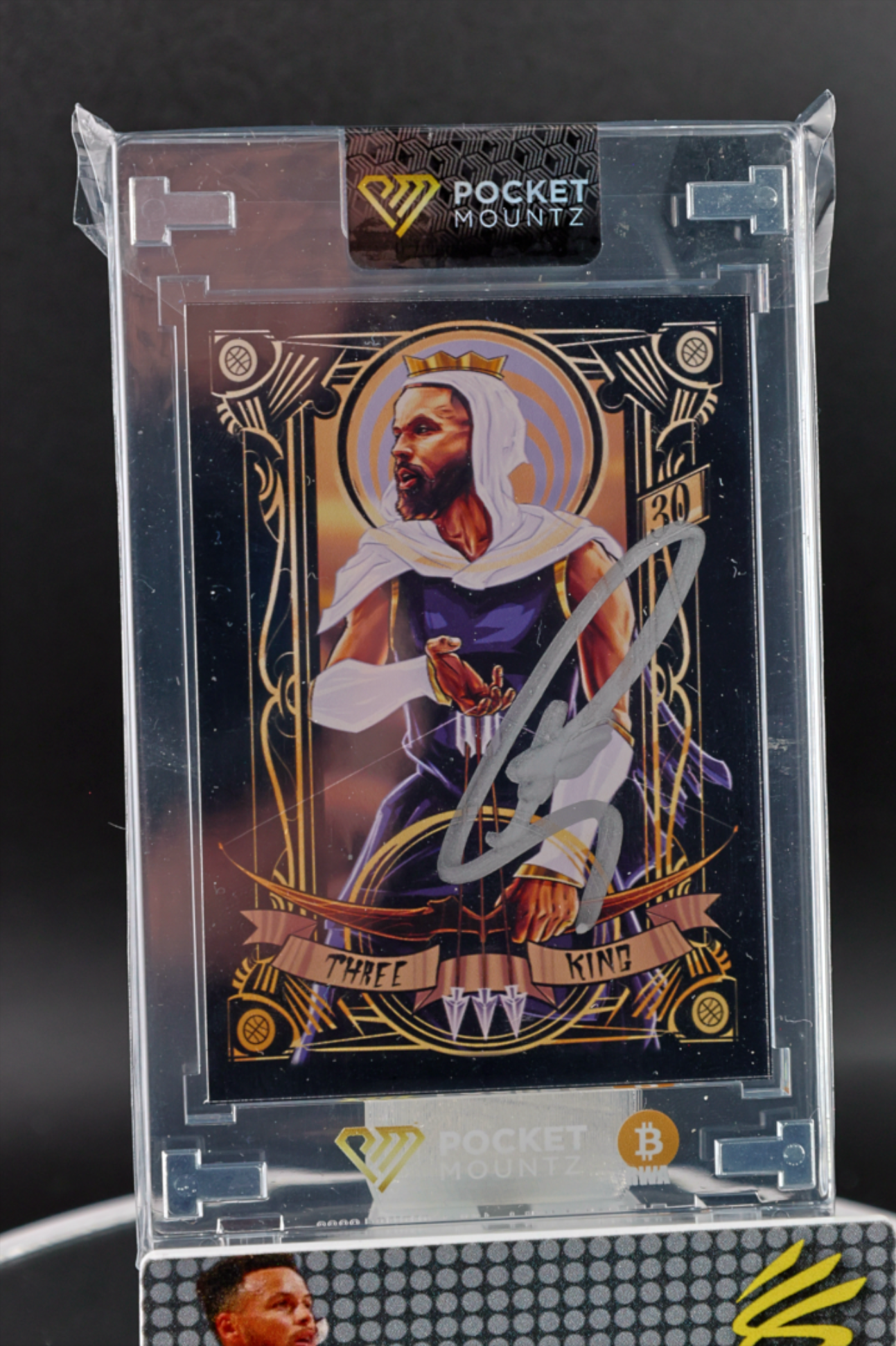 Elevate your collection with this rare Steph Curry "Three King" Pocket Mountz trading card, crafted for true fans and serious collectors. Each card is mounted on premium museum glass, offering crystal-clear display quality while preserving the artistry and detail of the design. This piece is a ONE of ONE, meaning it is entirely unique.